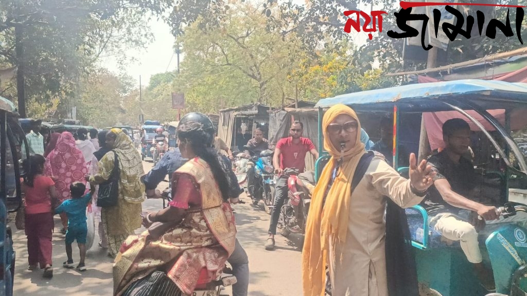 সায়ন ভান্ডারী, নয়া জামানা,বীরভূম: পবিত্র রমজান মাসে রোজা রেখেও দায়িত্ব পালনে কোনও খামতি রাখছেন না রেশমা পারভীন। তিনি সাব ট্রাফিক গার্ডের এলএইচজি হিসেবে কর্মরত। শহরের ব্যস্ততম এলাকাগুলিতে প্রতিদিনই তাঁকে ট্রাফিক নিয়ন্ত্রণে সক্রিয় ভূমিকা নিতে দেখা যায়।রামপুরহাট শহরের প্রাণকেন্দ্র পাঁচমাথা মোড়ে প্রায়শই ডিউটিতে থাকেন রেশমা। সকাল থেকেই এই মোড়ে বাস, অটো, মোটরবাইক ও ছোট গাড়ির চাপ বাড়তে থাকে। অফিসযাত্রী থেকে শুরু করে ব্যবসায়ী, স্কুল-কলেজ পড়ুয়া সব মিলিয়ে দিনের বেশির ভাগ সময়ই ব্যস্ত থাকে এলাকা। সেই ভিড়ের মধ্যেই নির্ধারিত পোশাক পরে হাতে বাঁশি নিয়ে সড়কের মাঝখানে দাঁড়িয়ে একদিকে যানবাহন থামানো এবং অন্যদিকে নিয়ম মেনে ছেড়ে দেওয়ার কাজ সামলান তিনি। তাঁর তৎপরতায় যান চলাচল অনেকটাই নিয়ন্ত্রিত থাকে বলে জানান স্থানীয়রা।তবে শুধু পাঁচমাথা মোড়েই নয় ডিউটির প্রয়োজন অনুযায়ী রামপুরহাট শহরের গ্যাস গুলি এলাকা কোর্টের গলি এবং দেশবন্ধু রোড-সহ বিভিন্ন গুরুত্বপূর্ণ সংযোগস্থলেও তাঁকে দায়িত্ব পালন করতে দেখা যায়। যেখানে যানজটের সম্ভাবনা বেশি বা ভিড় বাড়ে, সেখানেই তাঁকে মোতায়েন করা হয়। প্রতিটি ক্ষেত্রেই সমান নিষ্ঠার সঙ্গে নিজের দায়িত্ব পালন করেন রেশমা।ট্রাফিক নিয়ন্ত্রণের পাশাপাশি পথচারীদের নিরাপদ পারাপার নিশ্চিত করতেও তাঁকে সক্রিয় ভূমিকা তেই দেখা যায়। বিশেষ করে বয়স্ক মানুষ, নারী ও স্কুল পড়ুয়াদের রাস্তা পার করাতে প্রয়োজনে নিজেই এগিয়ে যান। ব্যস্ত সড়কে দাঁড়িয়ে পরিস্থিতি সামাল দেওয়ার সময় ধৈর্য ও সংযম বজায় রাখেন তিনি। তীব্র রোদ, গরম হাওয়া কিংবা হঠাৎ বৃষ্টি কোনও প্রতিকূল আবহাওয়াই তাঁর বাধা হয়ে দাঁড়াতে পালনে বাধা হয়ে দাঁড়ায় না।